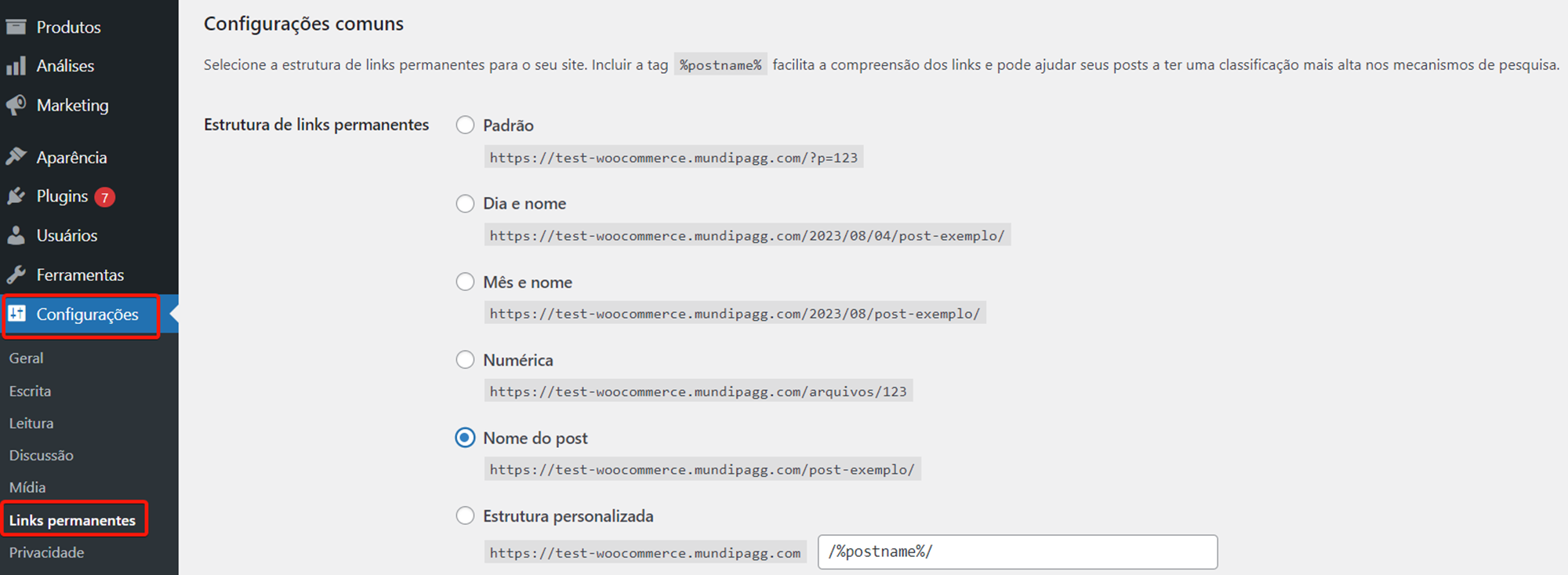 Em sua loja Woo, no menu lateral esquerdo clique em: Configurações > Links permanentes.
